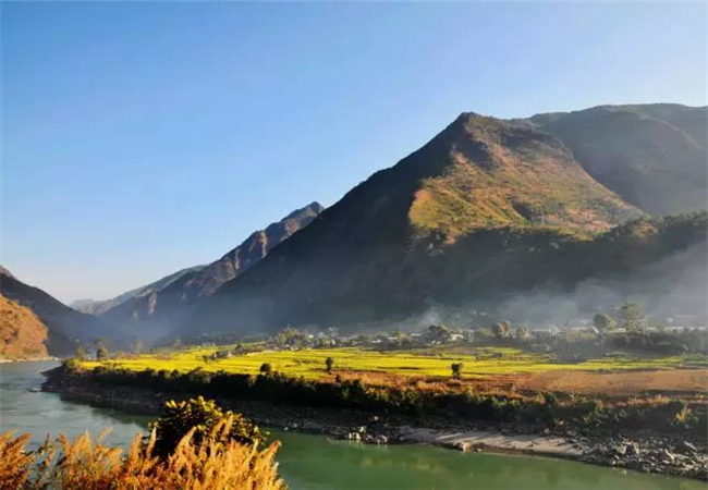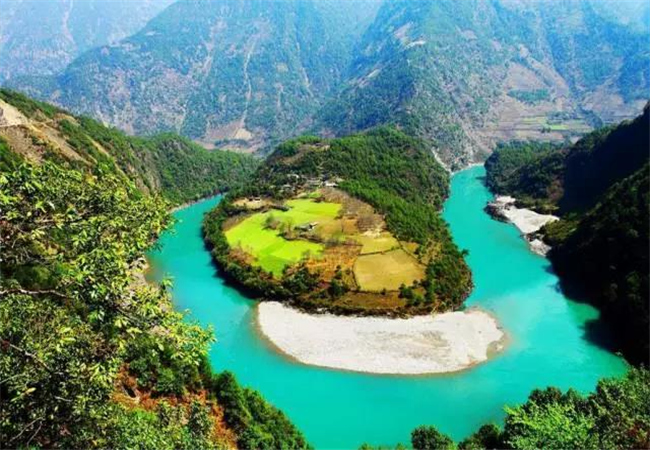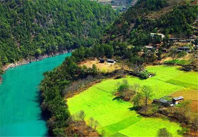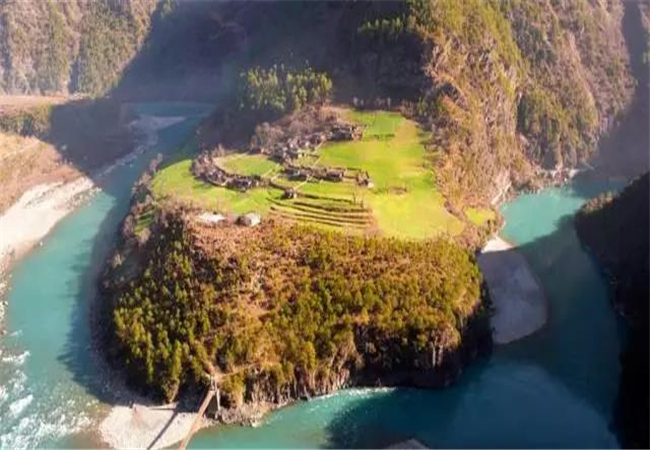 坎桶村這里江面海拔1710余米,風(fēng)光綺麗,構(gòu)成三面環(huán)水的半島狀小平原。