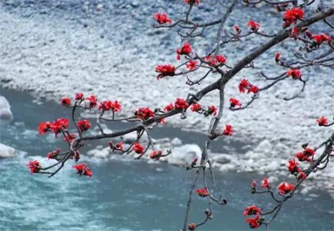 岸邊一朵朵紅彤彤的木棉,也不甘示弱,用盡渾身解數(shù)爭相開放。