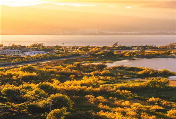縱目而望,寬闊的湖面上,池水后浪擊打著前浪,浩浩蕩蕩涌來,幾葉小舟行駛在水面上,也激起層層波浪。傍晚時分,在夕陽的余暉下,遠處的西山變得若明若暗,滇池也鍍上了一層金黃色的光芒,晚風徐徐,置身其中,感受天地萬物,煩惱全無。