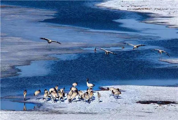 此時正是黑頸鶴的越冬期,銀裝素裹的雪地配上大批的黑頸鶴,云海翻騰、云霧彌漫,黑頸鶴在云霧中行走、翱翔,如夢如幻,仿佛人間仙境。