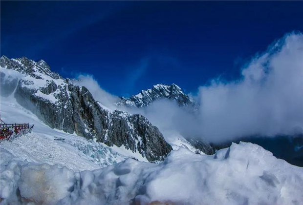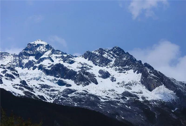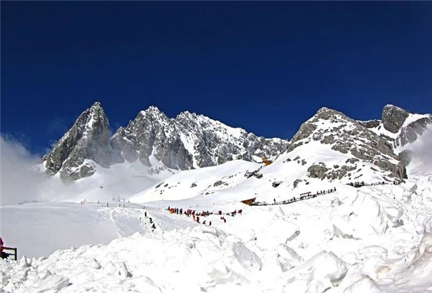 遇到雪花飄落時,玉龍雪山仿佛被潔白的被子覆蓋,巍峨高聳,直插云霄,一眼看不到邊,給人一種神秘感和無限遐想。
