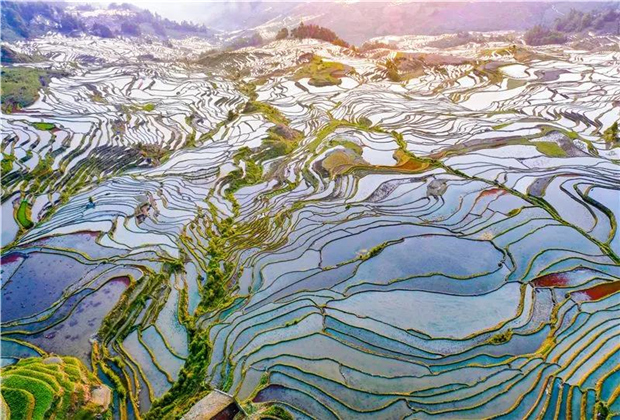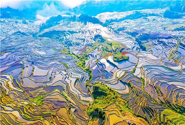 居高下視,夏天鋪天蓋地的綠,處處生機盎然,注滿水的梯田,層層疊疊,形狀各異;深秋時節(jié),稻谷成熟,夕陽余暉下,金黃稻浪,層次分明,錯落有致;冬春時節(jié)灌滿水的梯田閃爍著銀白色的光芒,梯田中倒映著藍天白云,云海漂浮,云蒸霞蔚,好似一幅氣象萬千的水墨畫,讓人身臨其境。