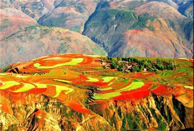東川紅土地位于昆明市北偏東方向,是云南紅土高原上最集中、最典型、最具特色的紅土地,從高空俯瞰,這片土地,雄偉壯觀、五彩斑斕,山川和原野呈現(xiàn)出一片片暗紅、紫紅、磚紅等不同的紅色,就像上天涂抹的色塊,色彩絢麗斑斕,襯以藍天、白云和那變幻莫測的光束,美得驚心動魄,令人嘆為觀止。
