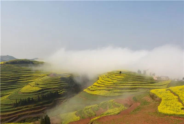 俯瞰大地,羅平梯田千層萬疊,陡坡溝壑,群峰千嶺。若到春季,金燦燦的油菜花鋪滿大地,遠遠望去,云海、梯田、油菜花海與村莊相映成趣,宛如一幅畫卷。在高原溫暖的陽光下,油菜花充滿著蓬勃的朝氣,洋溢著金燦燦的激情,染黃沃土,散發(fā)出的芳香馥郁整個蒼茫大地。