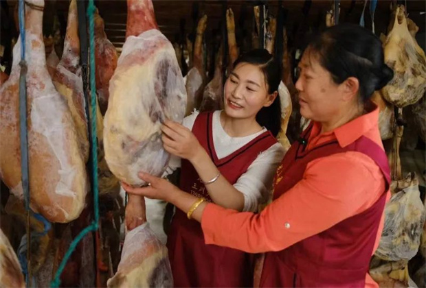 三川火腿,憑借水土、氣候條件以及民間獨(dú)特工藝,經(jīng)繁瑣工序精心腌制而成。其制作技藝,至今已有600多年歷史。三川火腿,是將臘月豬豬腿修飾成琵琶狀,抹上幾輪高度白酒和食鹽,腌制一個(gè)月。出缸后用白皮紙粘封開口無皮處,再將火腿在通風(fēng)和陰涼的地方晾掛3個(gè)月左右。