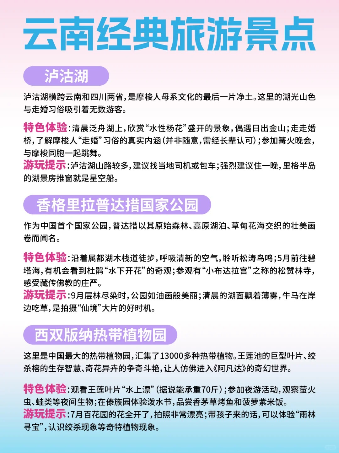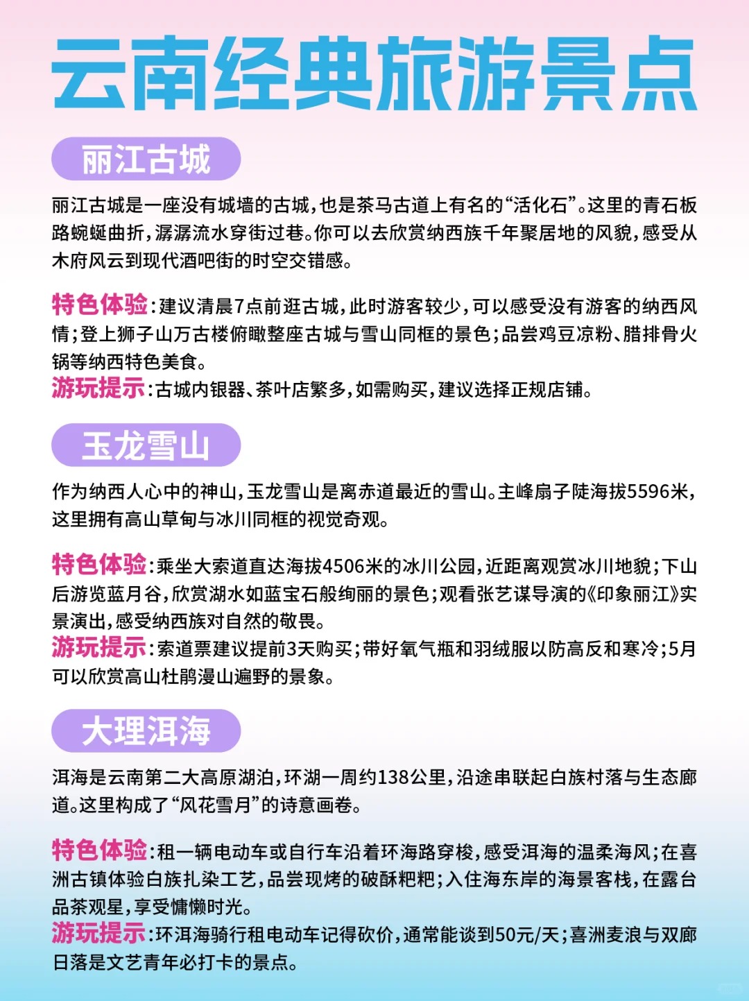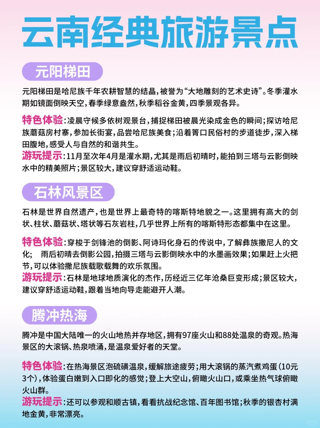 想來云南旅游的小伙伴,這是一份云南經(jīng)典旅游景點(diǎn)的詳細(xì)介紹,希望能幫助你更好地規(guī)劃行程